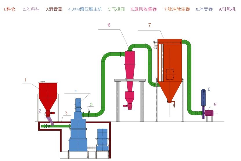 JXM環(huán)輥微粉磨(中速微粉磨)全套設(shè)備包括:錘式破碎機、斗式提升機、儲料倉、電磁振動給料機、主機、選粉機、擴散式雙旋風(fēng)集粉器、脈沖式除塵器、高壓風(fēng)機、消聲器。主機電動機通過減速機帶動主軸及各層轉(zhuǎn)盤旋轉(zhuǎn),轉(zhuǎn)盤通過柱銷帶動幾十個環(huán)輥在磨環(huán)滾道內(nèi)滾動并旋轉(zhuǎn)。大塊物料經(jīng)破碎機破碎成小顆粒后由提升機送入儲料倉,電磁振動給料機將物料均勻的送到上轉(zhuǎn)盤的中部,物料在離心力的作用下散向圓周邊,并落入磨環(huán)的滾道內(nèi)被環(huán)輥沖壓、滾碾、研磨而粉碎,物料經(jīng)第 一層粉碎后又落入第二層及第三層,高壓離心風(fēng)機的抽吸作用將外部空氣吸入機內(nèi),并將經(jīng)過第三層粉碎后的粗粉帶入選粉機內(nèi)。選粉機內(nèi)旋轉(zhuǎn)的渦輪所產(chǎn)生的渦流使粗顆粒物料回落重磨,細(xì)粉則隨氣流進(jìn)入旋風(fēng)集粉器并由其下部的卸料閥排出即為成品,而帶有少量細(xì)粉塵的氣流則經(jīng)過脈沖除塵器凈化后通過風(fēng)機及消聲器排出。